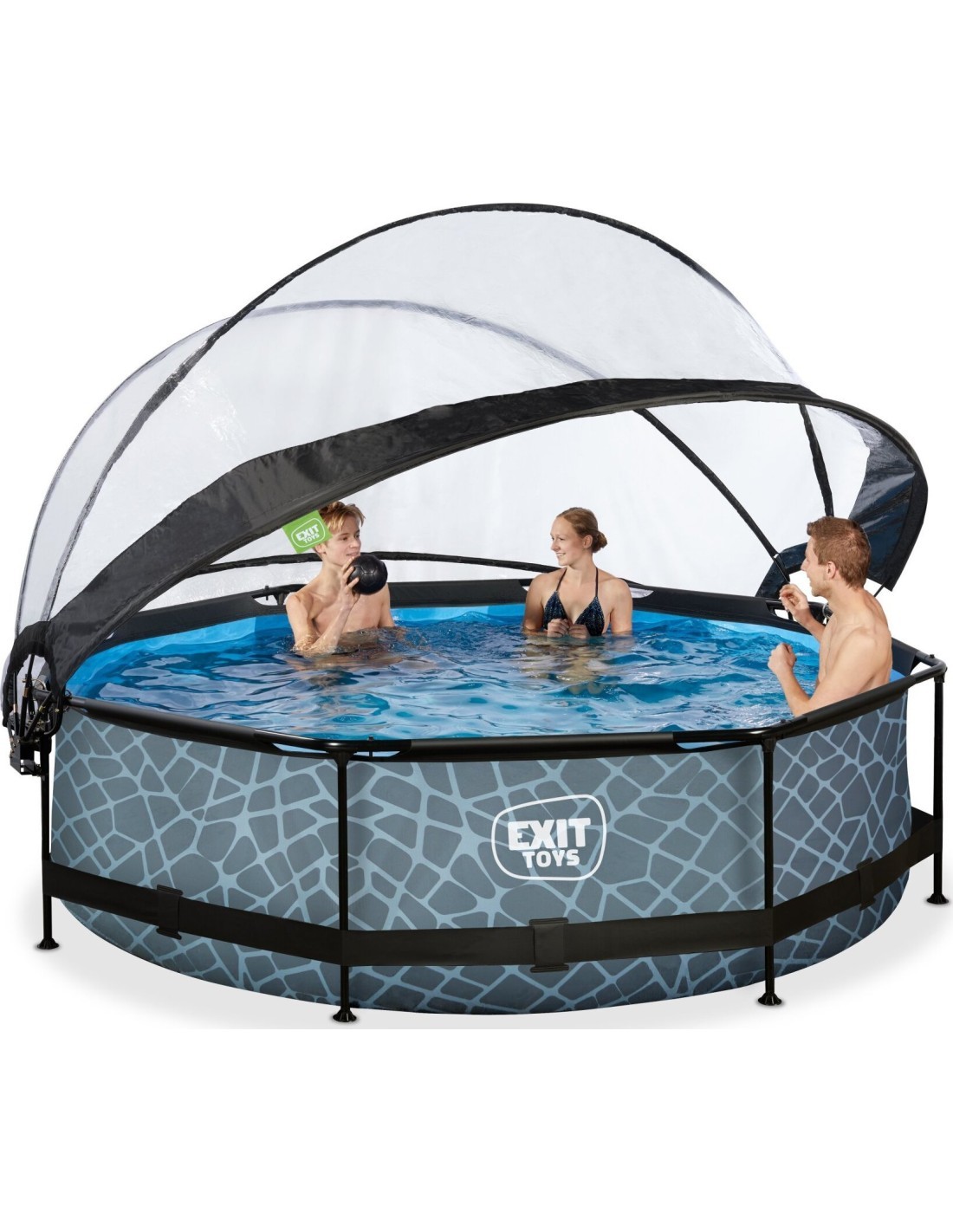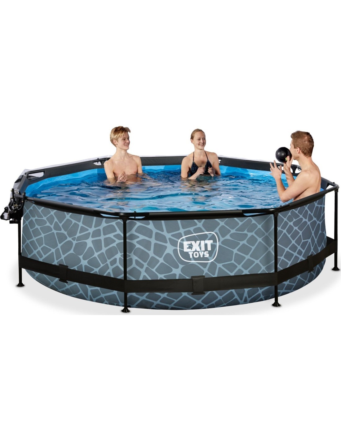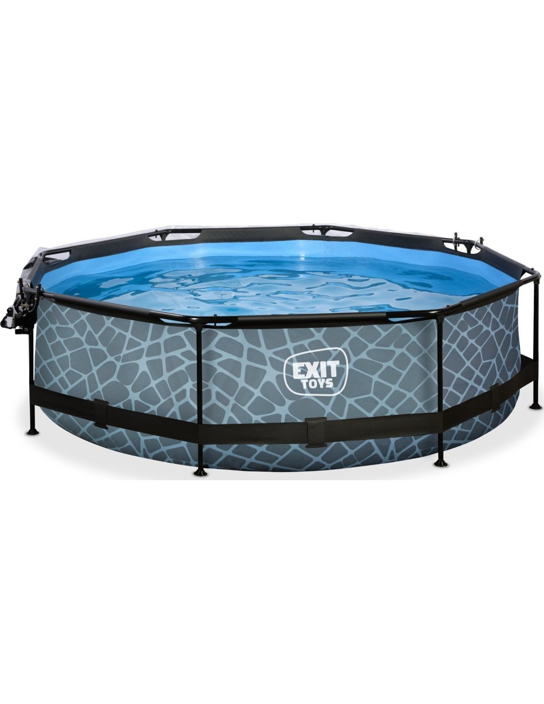 Baseins EXIT Stone ø300x76cm ir apaļš pelēkas krāsas rāmja baseins ar kupolu. Baseins ir aprīkots ar filtra sūkni un patiešām izceļas ar vēso akmens rakstu. Vai meklējat jautru, bet arī unikālu un kvalitatīvu rāmja baseinu savam dārzam? Izstādi ar EXIT Toys apaļajiem baseiniem!