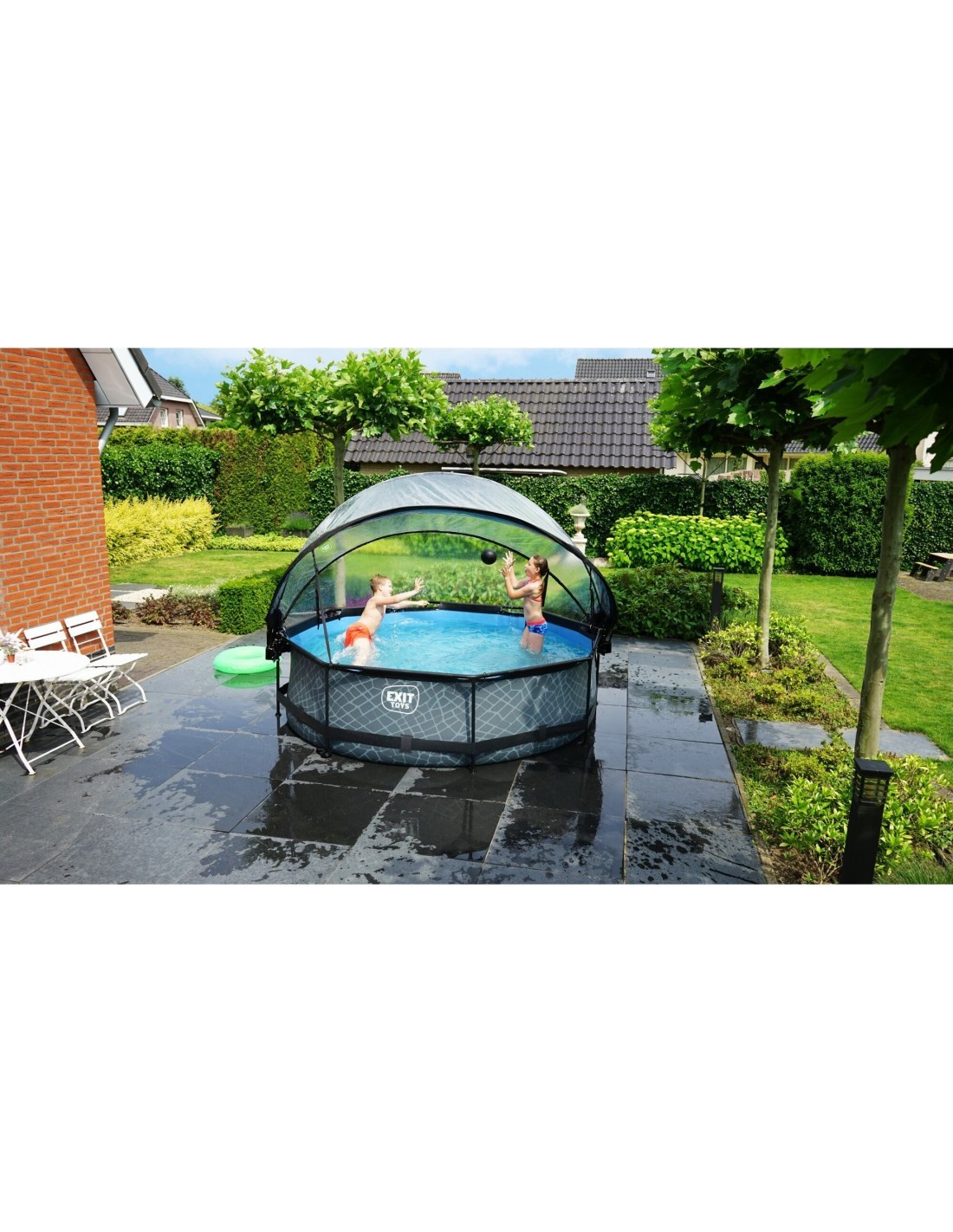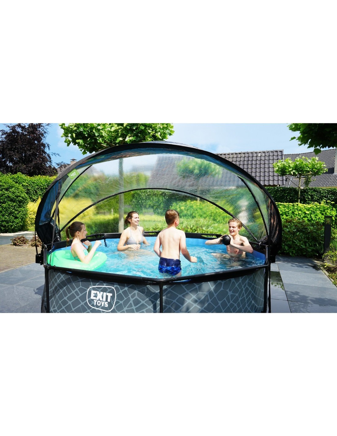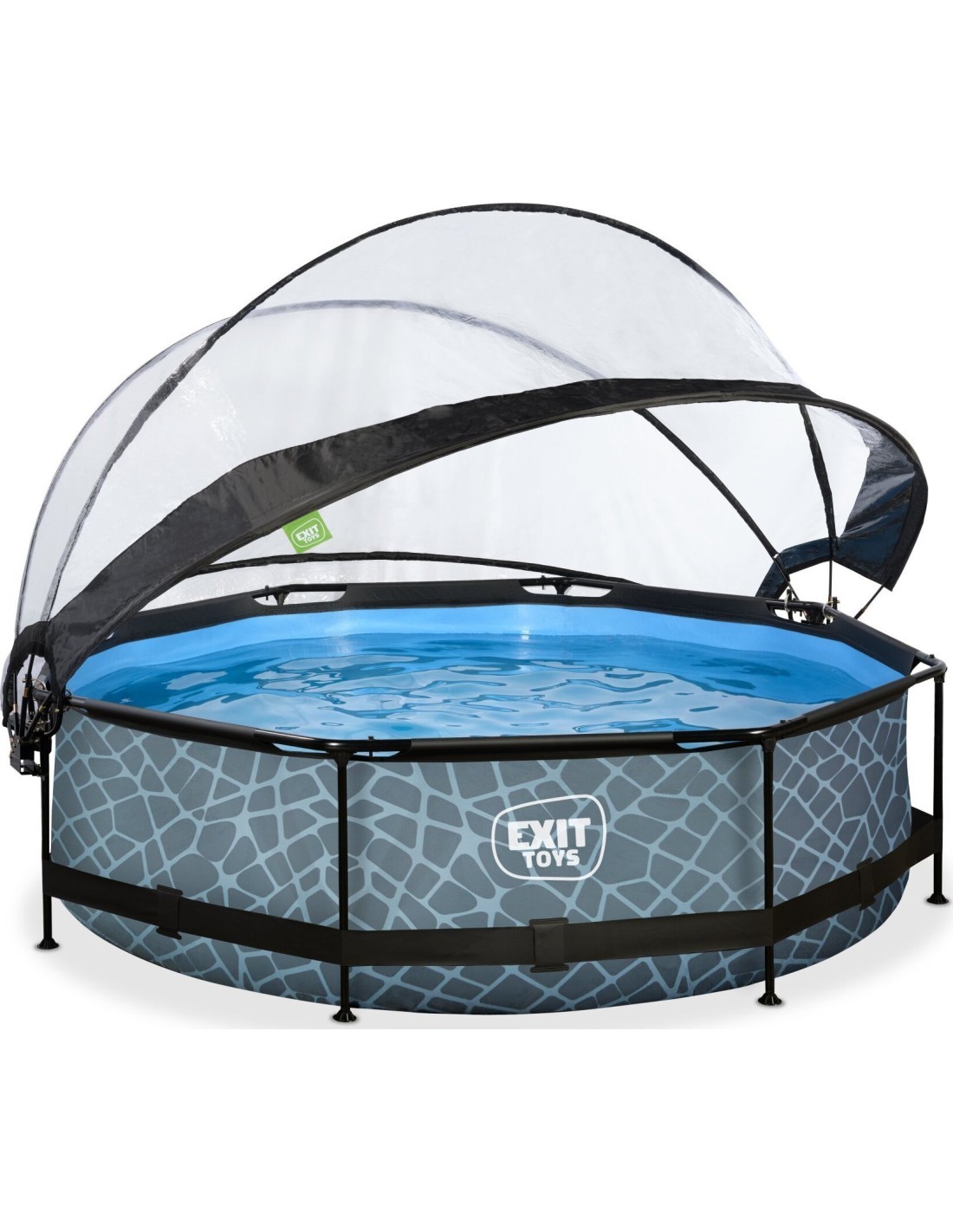 Baseins EXIT Stone ø300x76cm ir apaļš pelēkas krāsas rāmja baseins ar kupolu. Baseins ir aprīkots ar filtra sūkni un patiešām izceļas ar vēso akmens rakstu. Vai meklējat jautru, bet arī unikālu un kvalitatīvu rāmja baseinu savam dārzam? Izstādi ar EXIT Toys apaļajiem baseiniem!