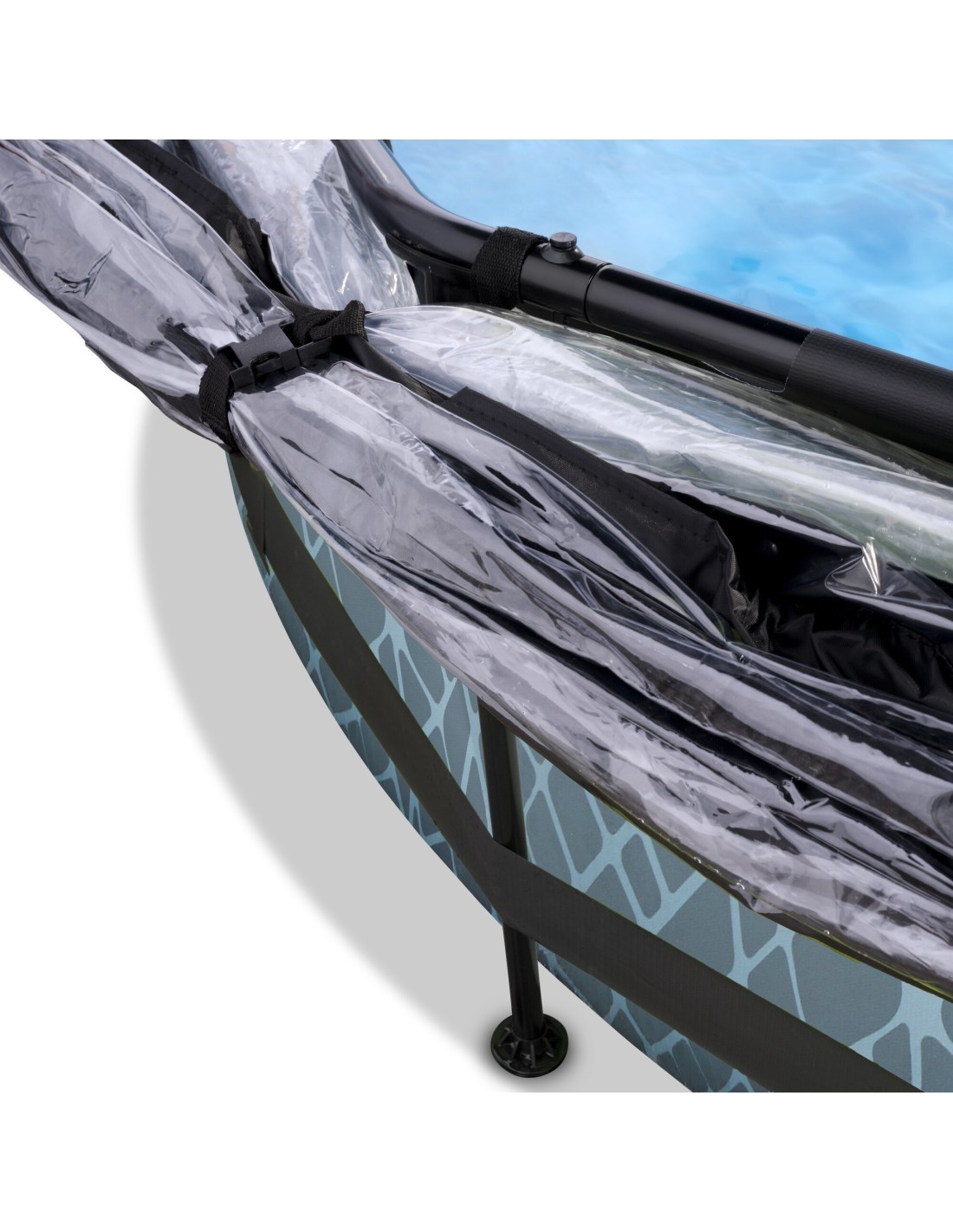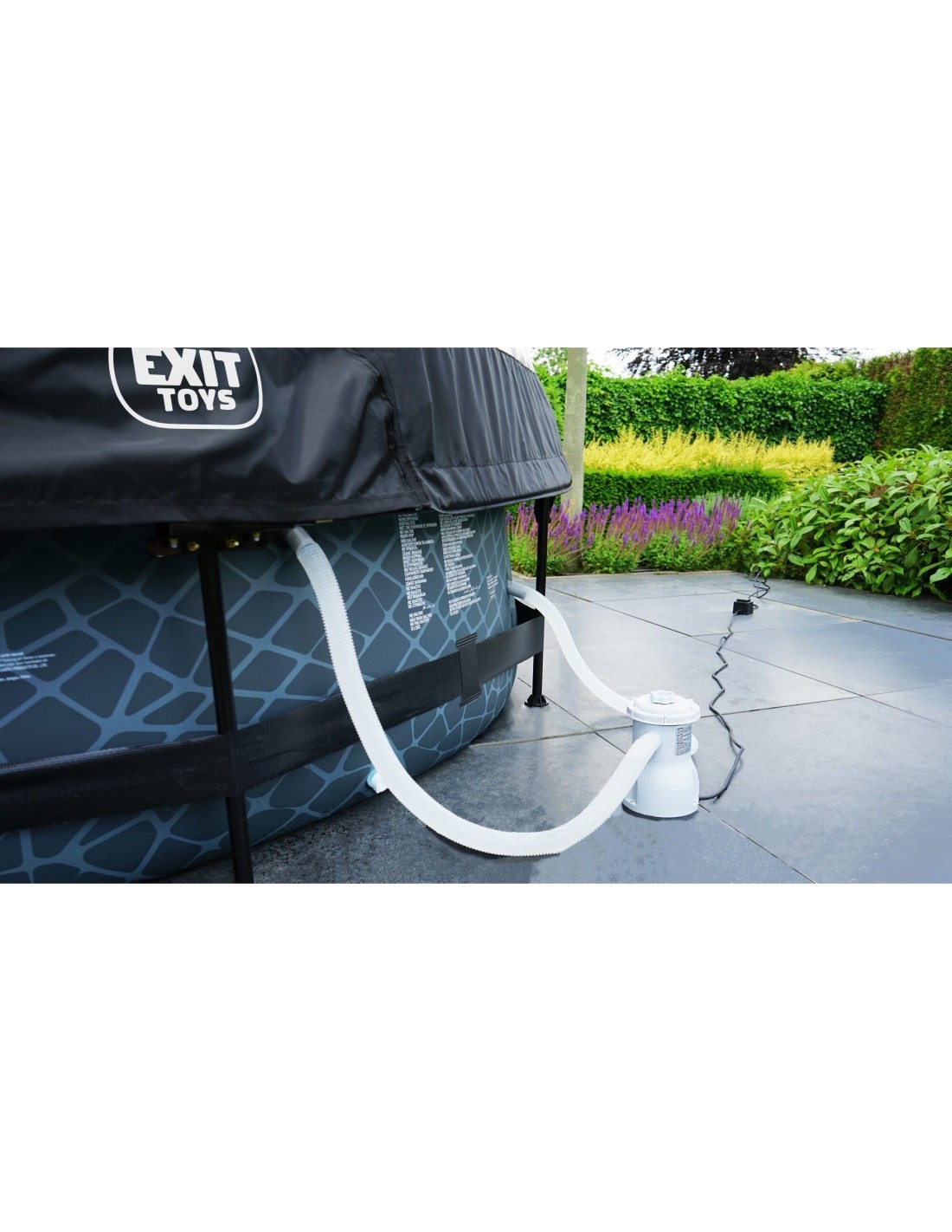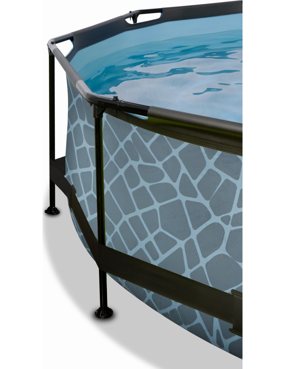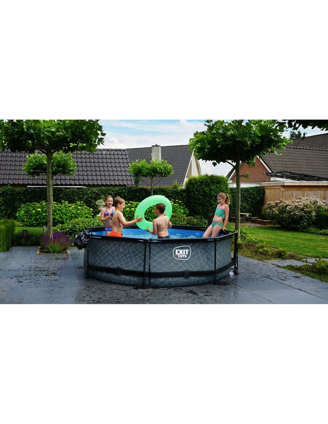 Izpētiet, cik izturīgs var būt apaļš virszemes baseins: EXIT Stone baseina pulverkrāsotais tērauda rāmis un izturīgās kājas nodrošina, ka baseins vienmēr būs stabils un kalpos gadiem ilgi. Komplektā iekļautais sūknis atsvaidzina ūdeni un nodrošina tā kustību, lai tas netiktu piesārņots. Filtra sūkni ir viegli piestiprināt pie baseina, un filtra kārtridži nodrošina, ka ūdens paliek tīrs un patīkams. EXIT Stone baseins vienmēr ir gatavs peldēšanai!