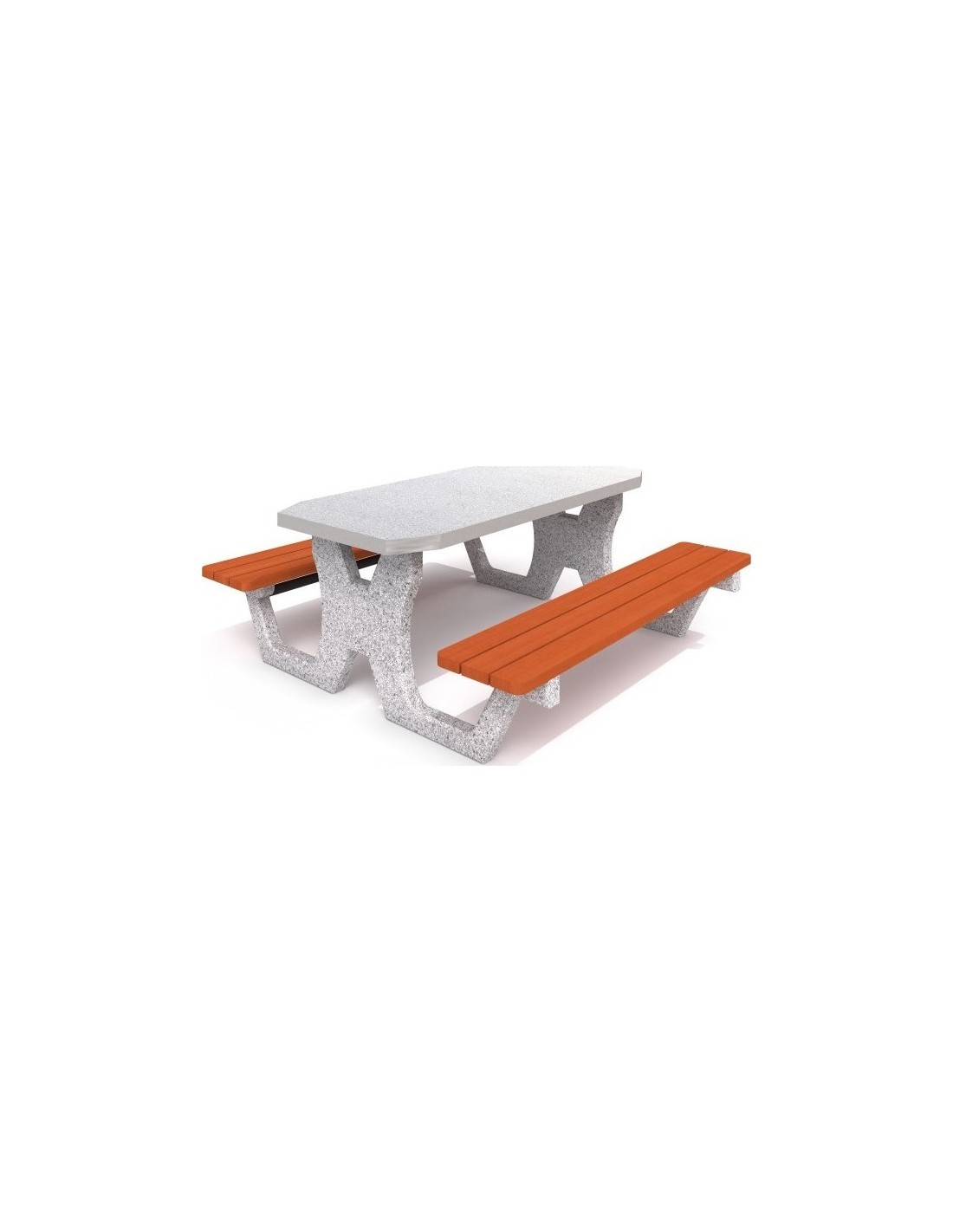 Concrete picnic table with 2 benches. Table top (thickness 6 cm) made of polished concrete with embedded gres tiles. The edge of the top made from aluminum. On the top there is a checkerboard for chess / checkers and board for ludo game. Seats made of spruce wood, 4 cm thick, painted twice with varnish on the selected color.