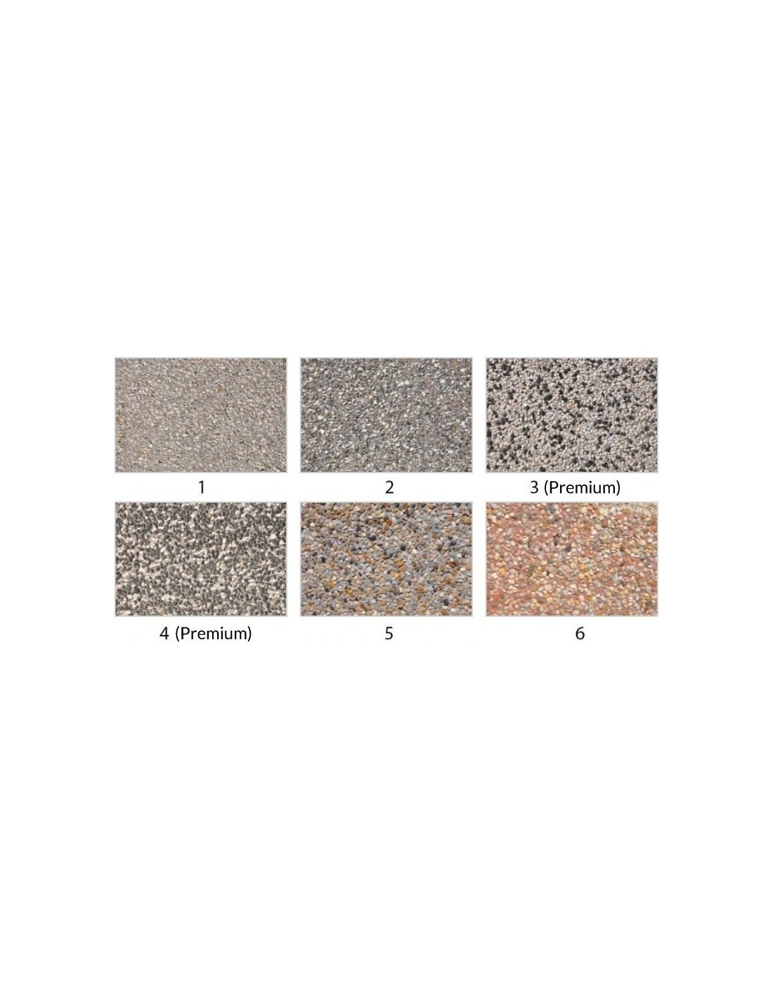 The structure is made of washed concrete covered with washed stone or a mixture of grits. The table top is made of polished concrete with embedded gres tiles. Seats made of spruce wood.