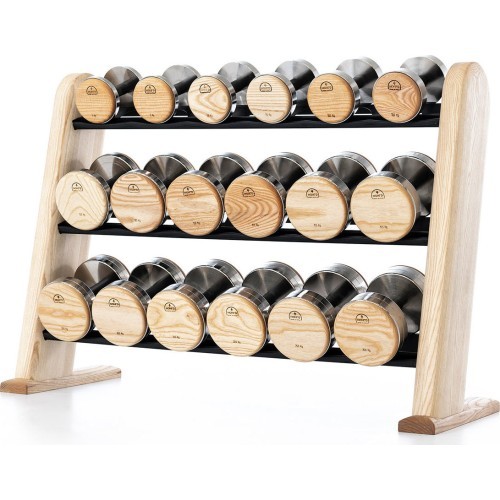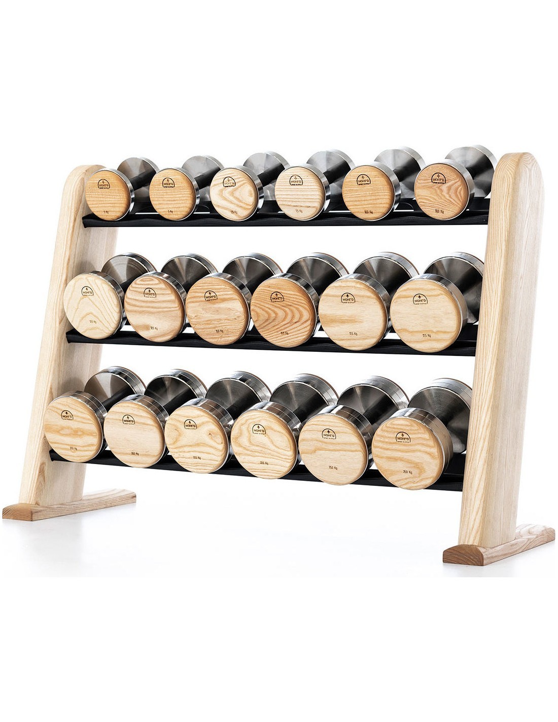 The NOHrD DumbBells and DumbBell-Rack are available in the full NOHrD wood pallet. DumbBells and rack both constitute a sleek, tailored design: the DumbBells diameter are kept uniform per row, while the angled, solid wood rack’s frame is designed for maximum space-saving and stability