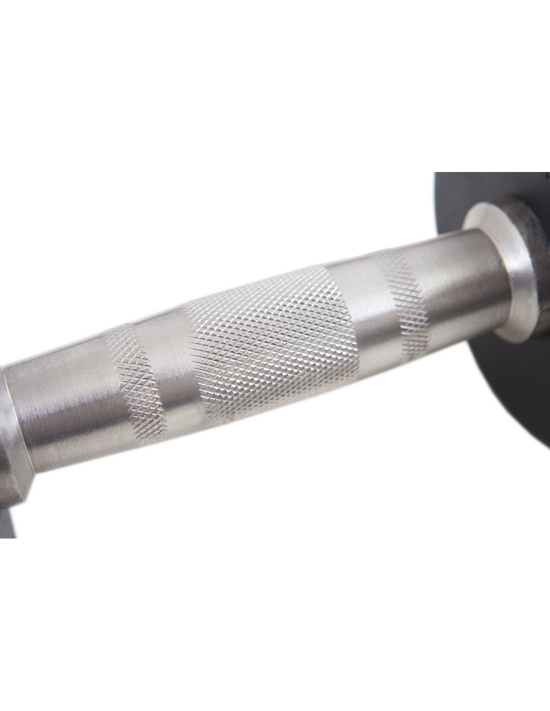 A extensive dumbbell set offers everyone the opportunity to give the body a complete workout. Really all your muscle groups from back to the legs can be trained with dumbbells. Especially in combination with an adjustable weight bench which offers you unprecedented training opportunities. The set of dumbbells are made of rubber with a chrome handle. The chrome handle is very nicely finished making it comfortable in the hand during training. Because the dumbbells are rubber it further minimizes the risk of damage. Noise from falling or colliding dumbbells is similarly minimized.