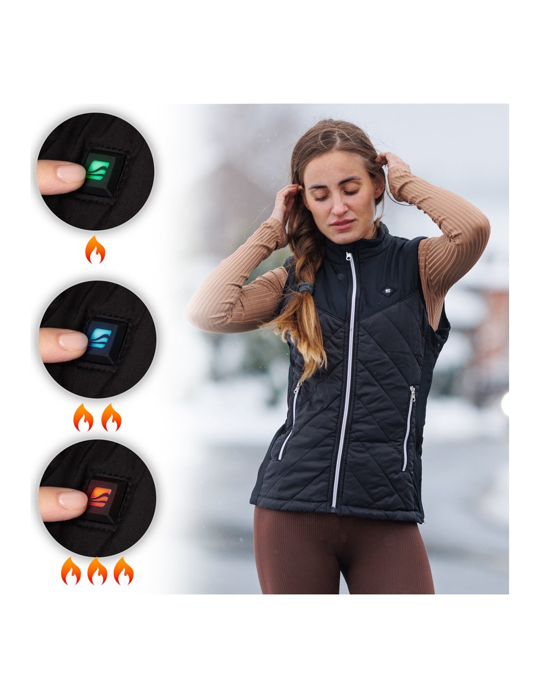Sildīšanas sistÄmu darbina jebkura baroÅ¡anas banka ar A tipa USB pieslÄgvietu (kas NAV iekļauta komplektÄ), ko var glabÄt sÄnu kabatÄ (tajÄ ir iebÅ«vÄts kabelis). Kad pievienojat kabeli baroÅ¡anas bankai, vienkÄrÅ¡i ilgi nospiediet pogu pie kabatas, lai sÄktu sildīšanas procesu. Ir pieejami 3 dažÄdi sildīšanas režīmi, kas ļauj pielÄgot sildīšanas intensitÄti atbilstoÅ¡i savÄm vÄlmÄm/paÅ¡reizÄjiem laika apstÄkļiem.