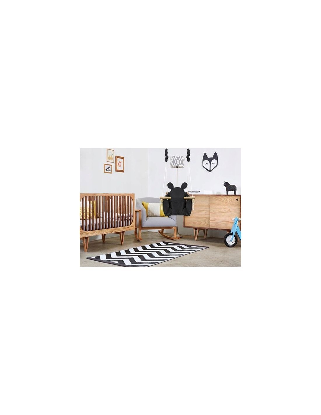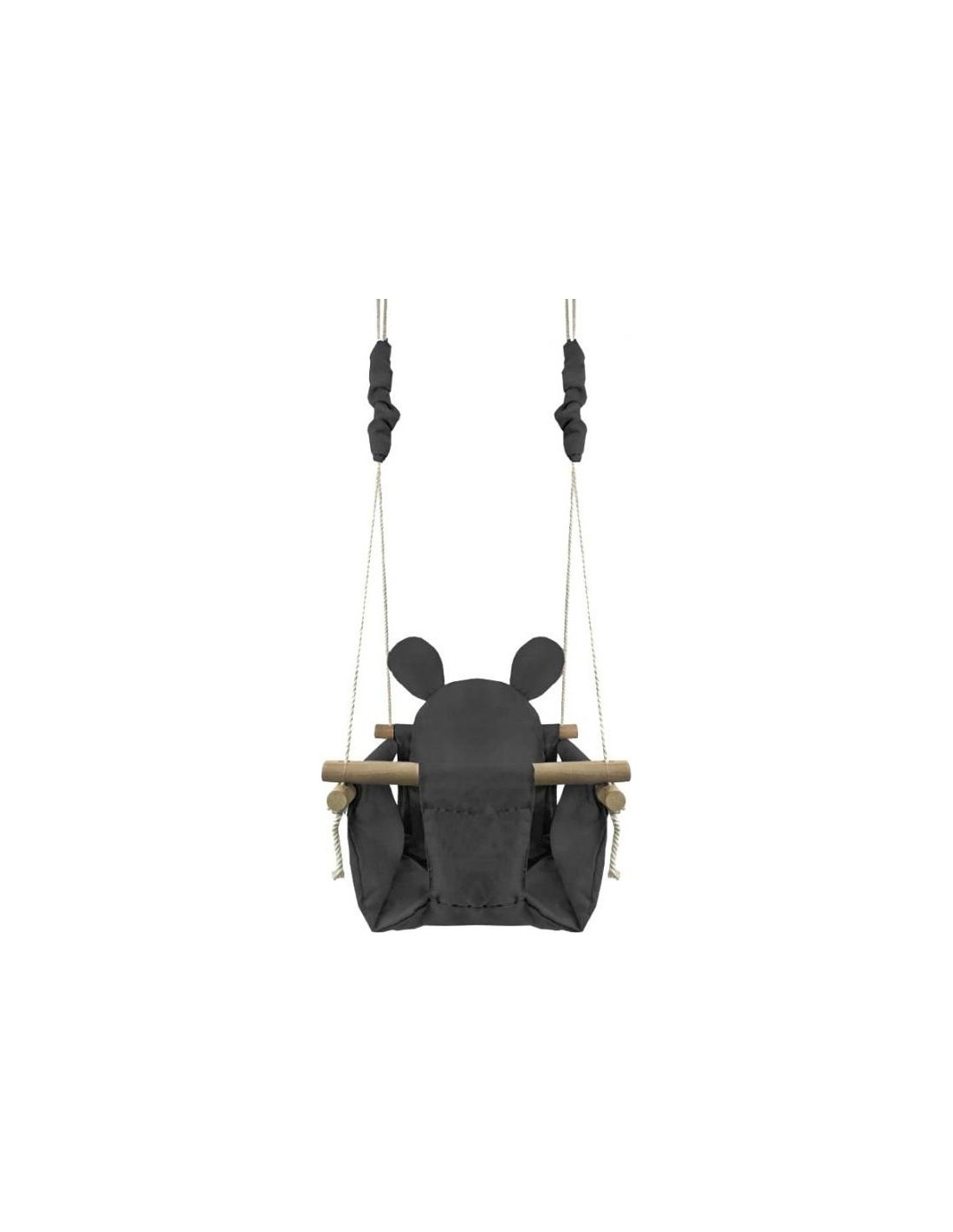 The swing frame is made of carefully sanded wood, which makes it completely safe for the child. The swing comes with three soft cushions made of easy-to-clean material. The height of the toy can be adjusted, the default length of the ropes is 90cm.