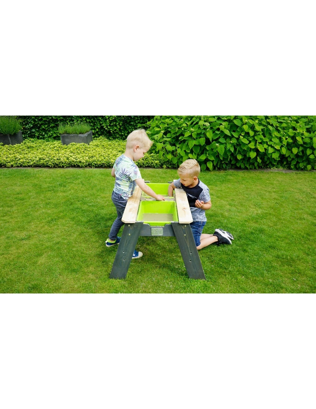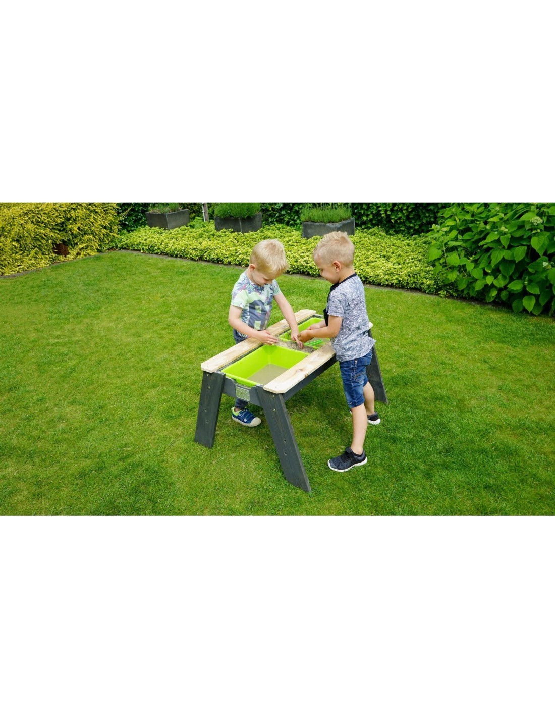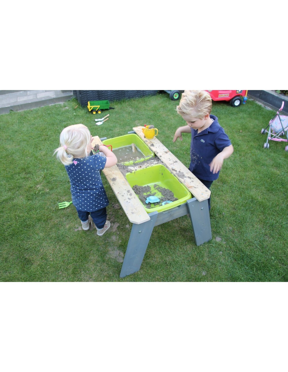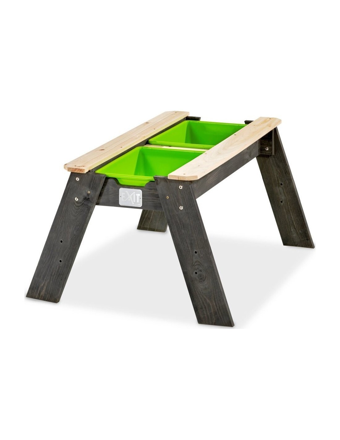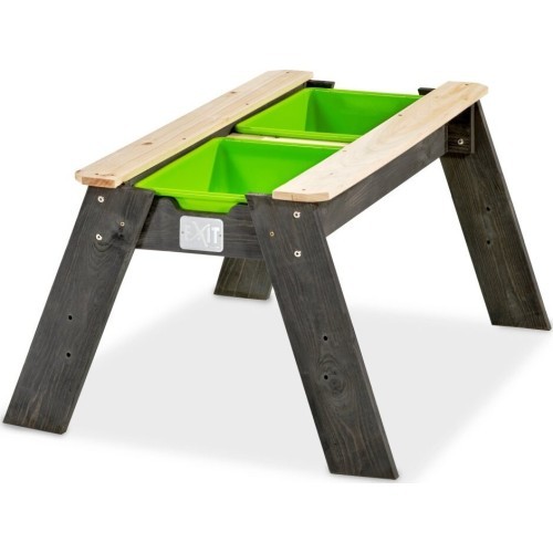 Abas iebūvētās zaļās tvertnes var noņemt, lai tās iztīrītu vai izmantotu citās rotaļās. EXIT Aksent smilšu un ūdens galds ir izgatavots no ilgtspējīgi ražotas koksnes glītā dizainā. Tie ir maigās krāsās (pelēkā un dabīgā), kas labi iederēsies jūsu dārzā!