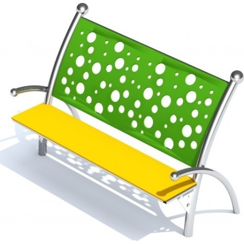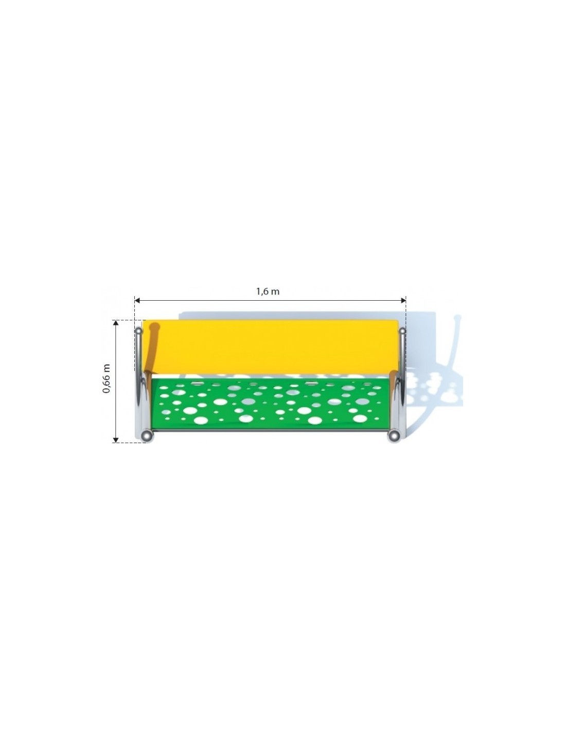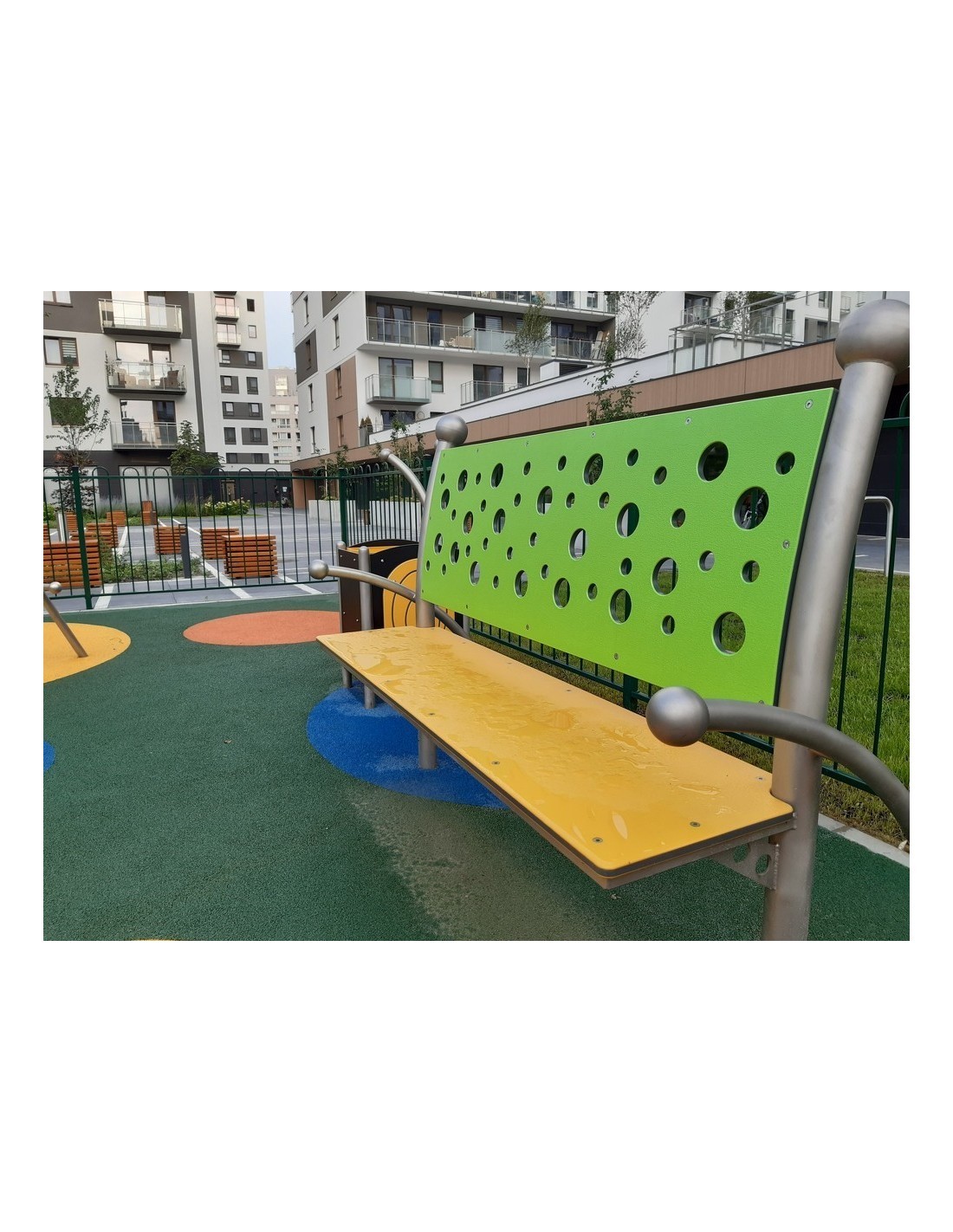Playground bench with backrest and handles with stylistics referring to the shapes of the snail and vivid colors. Construction made of stainless steel resistant to weather conditions and intensive use. The seat and backrest made of HDPE material. Thanks to this solution the seat it is not heating during sunny days and is not freezing during the winter. Posts ending with decorating round ball.