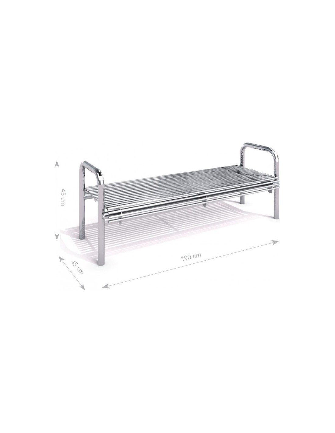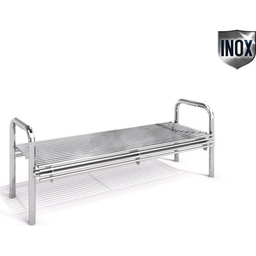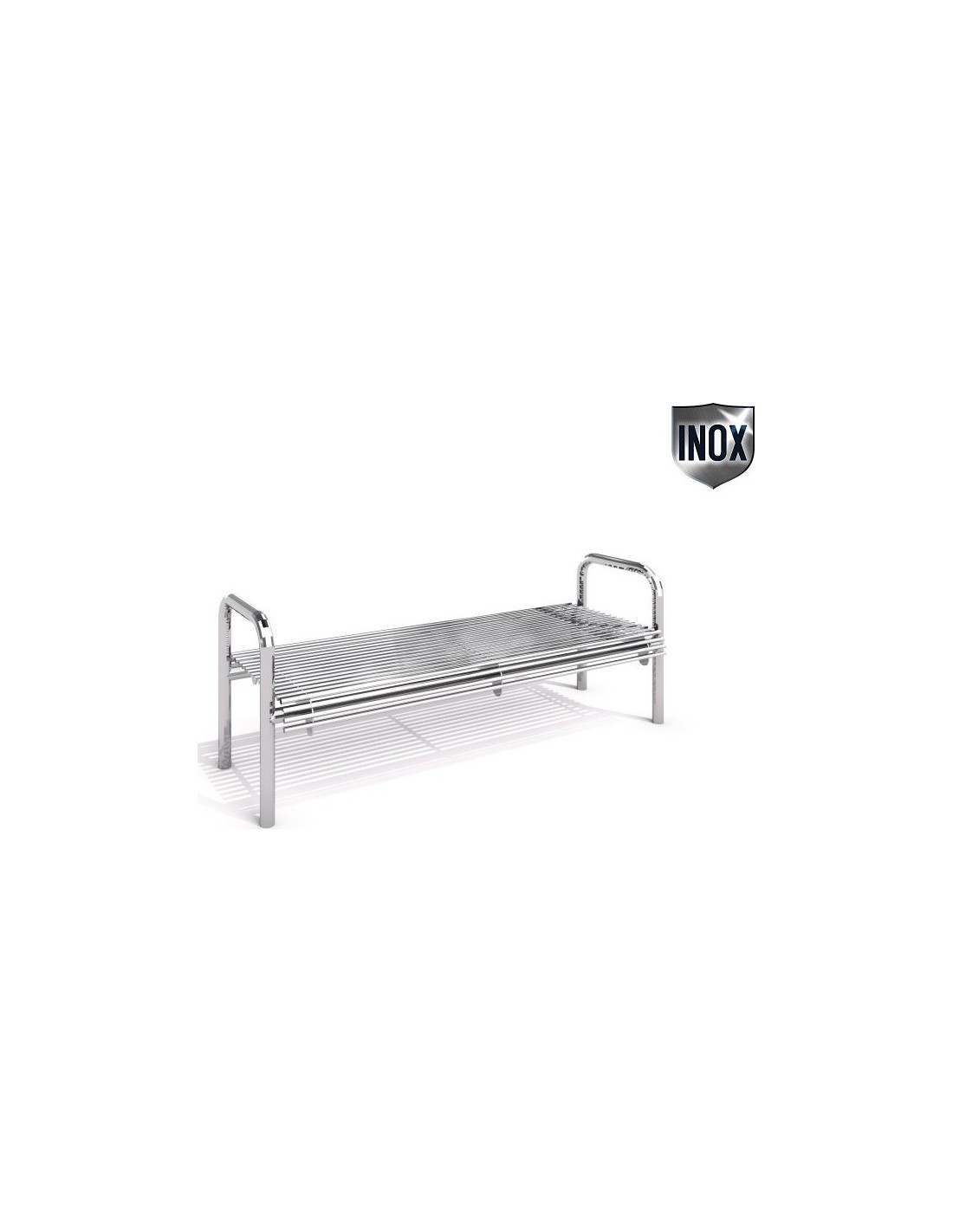 Stainless steel bench with armrests and without backrest. The seat is made of stainless steel. The bench keeps elegant and simple look of urban furniture.