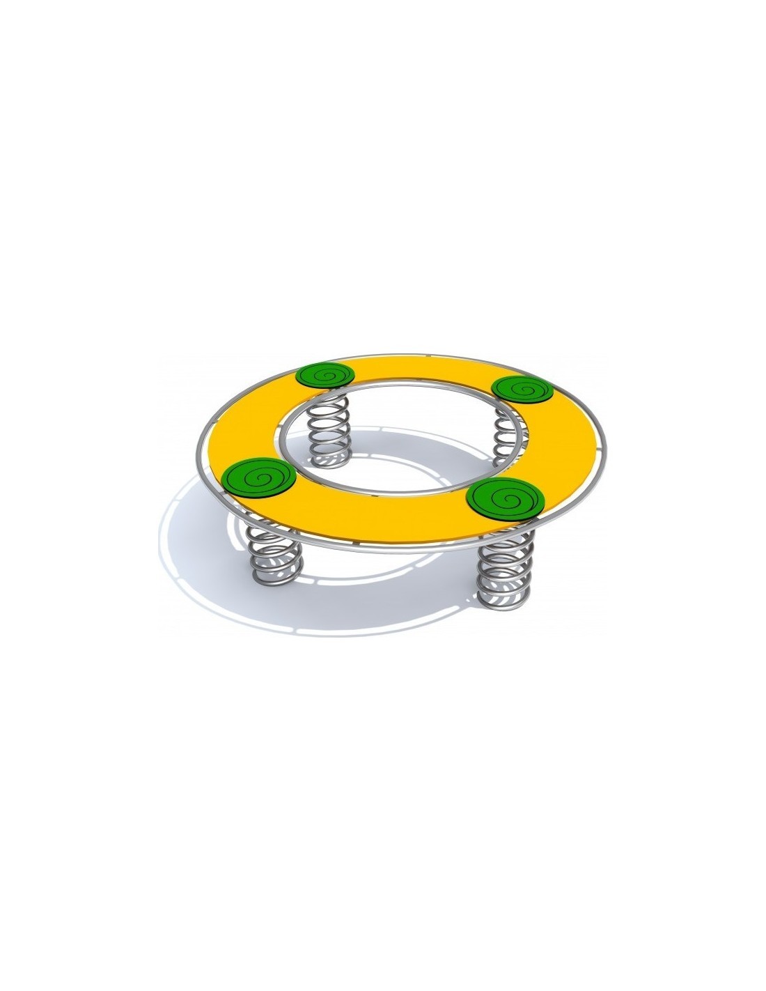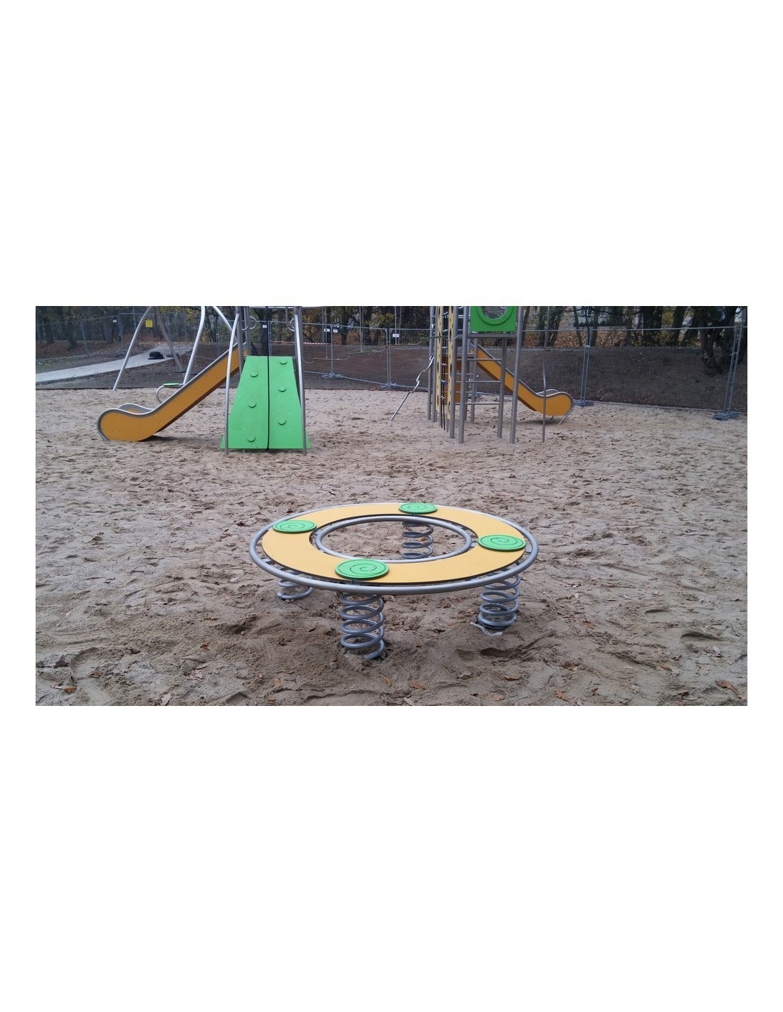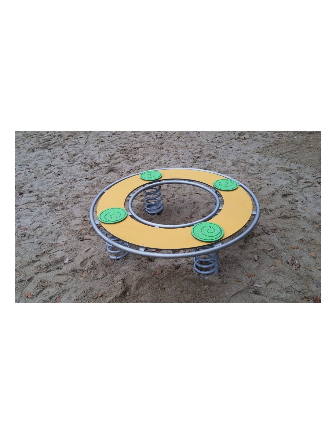 Playground spring toy with round platform which stylistics referring to the shapes of the snail and vivid colors. Construction made of stainless steel resistant to weather conditions and intensive use.