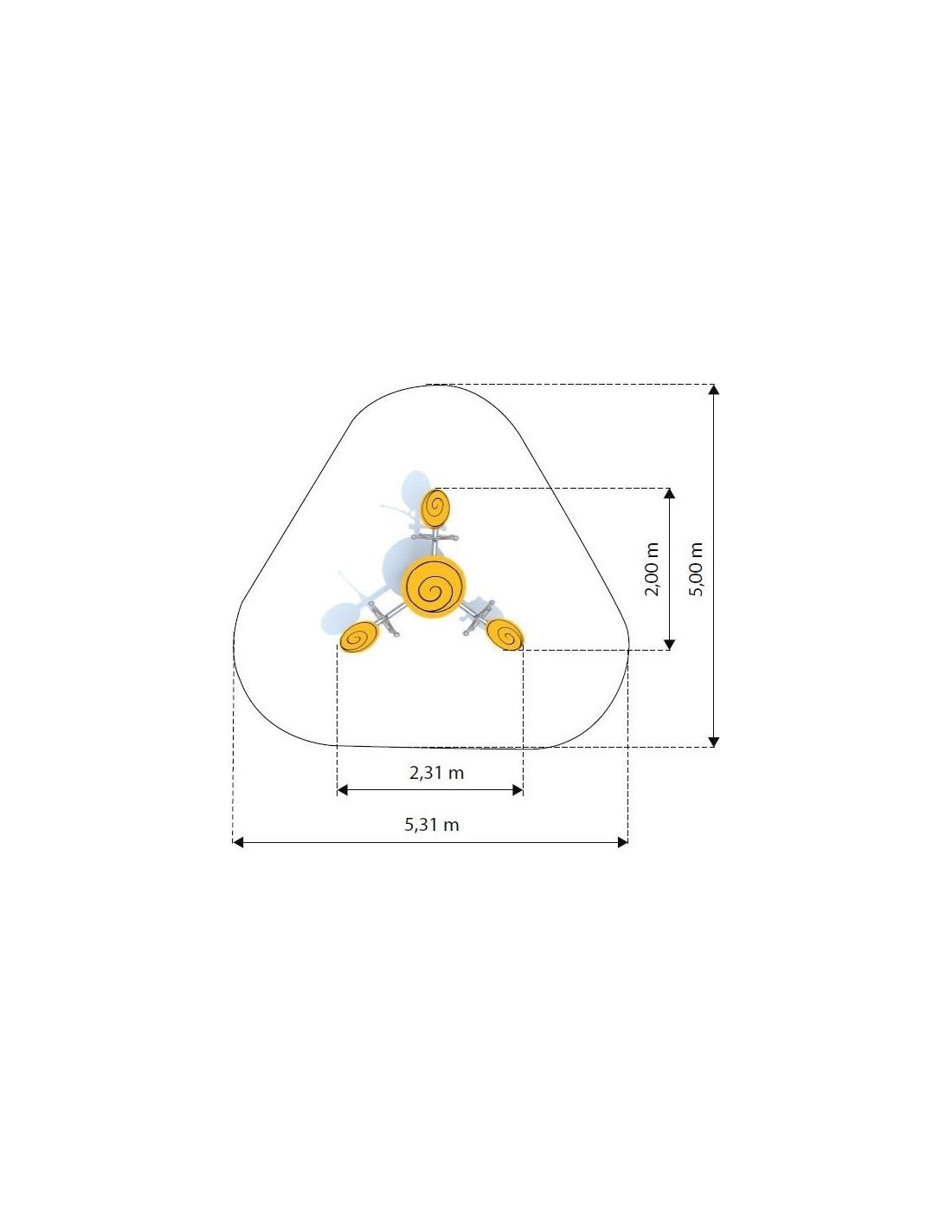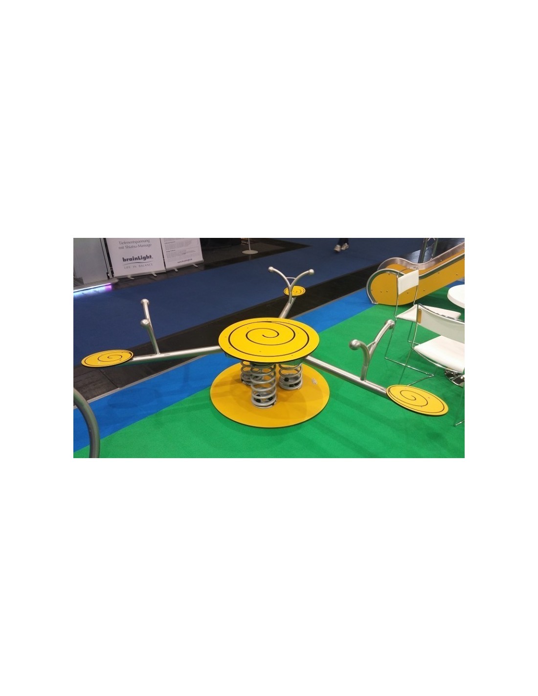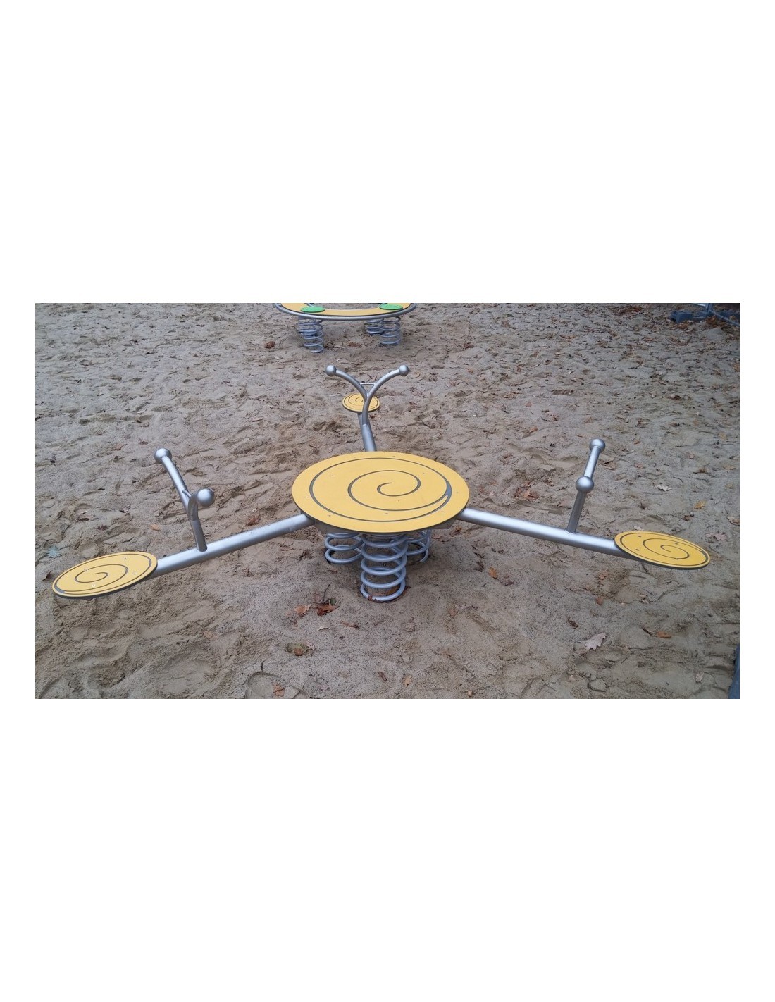 Playground spring toy with 3 seats and 3 springs with stylistics referring to the shapes of the snail and vivid colors. Construction made of stainless steel resistant to weather conditions and intensive use. Handles ending with decorative round ball forming to snail's horn.