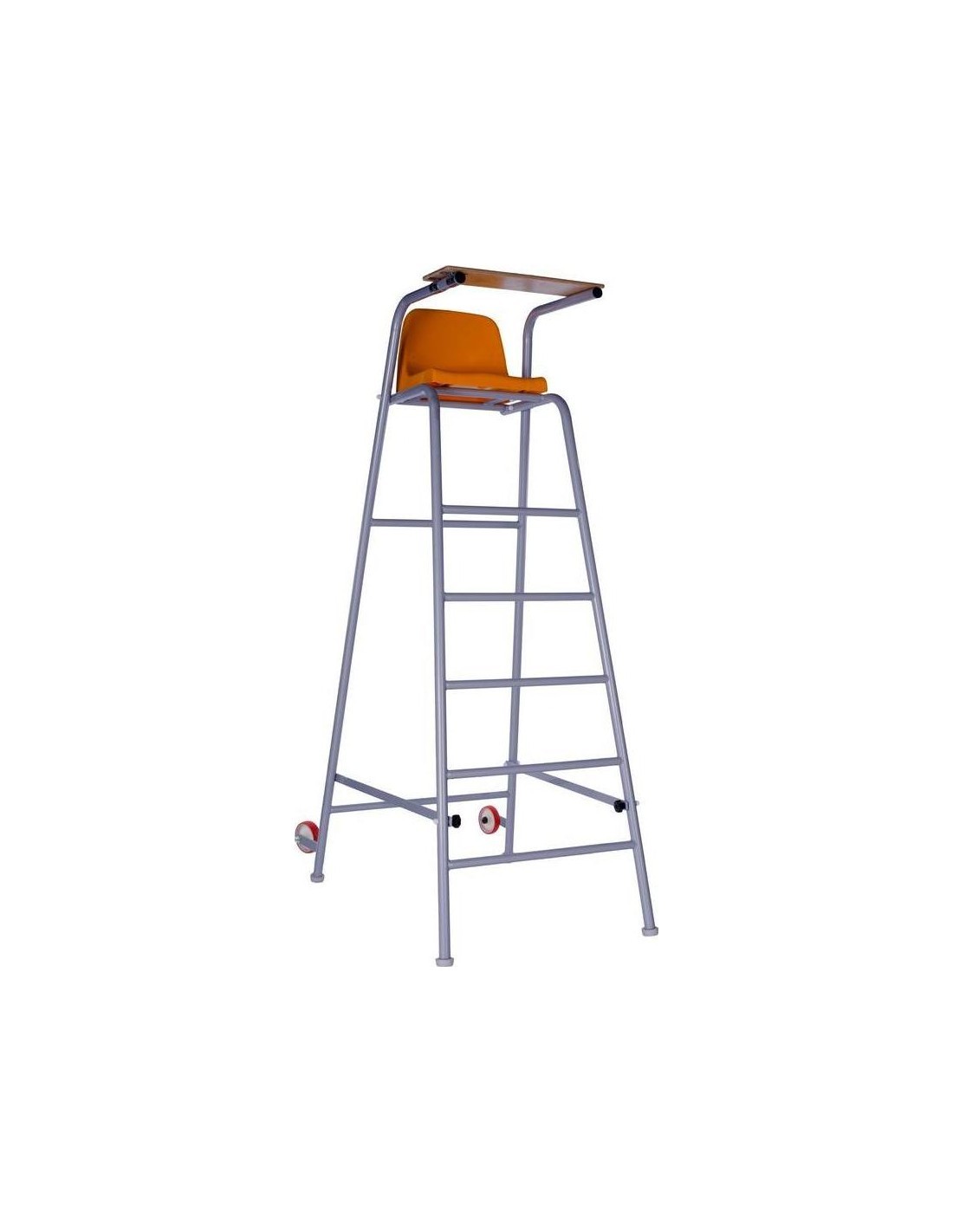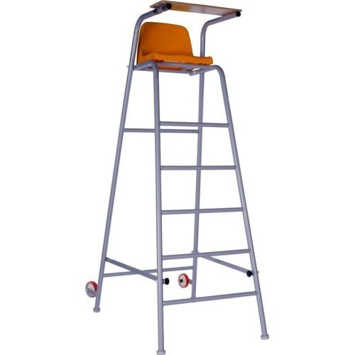 Our tennis referee chair is characterized by a sturdy, powder-coated at any requested colour , or hot-galvanized, tubular steel construction with four legs, equipped with nonslip, non-marking plastic floor pads with two transportation wheels, plastic seat with a backrest and a panel for writing; foldable. Suitable for both indoor and outdoor courts.