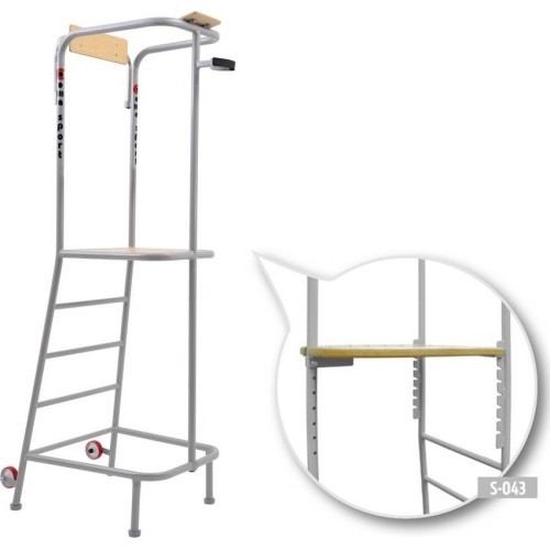 Sturdy, powder-coated (at any requested colour) tubular steel construction with four legs, equipped with nonslip, non-marking plastic floor pads, and two transportation wheels. The platform is made of hardwood or nonslip plywood. The stand is also equipped with a convenient hardwood plywood panel for writing, a backrest, and height adjustment. It is suitable for both indoor and outdoor courts.