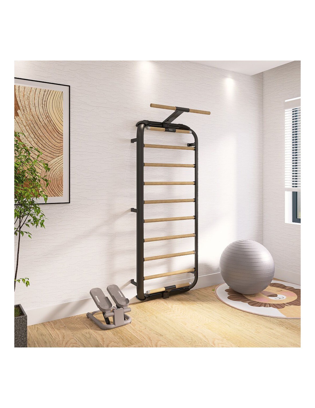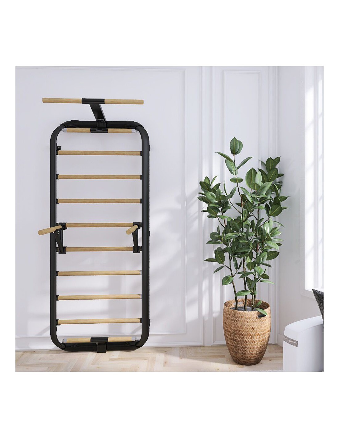 The Wootalux wall bars combine a metal frame, which ensures secure anchoring, and wooden bars, which are comfortable to touch and ensure a perfect grip.