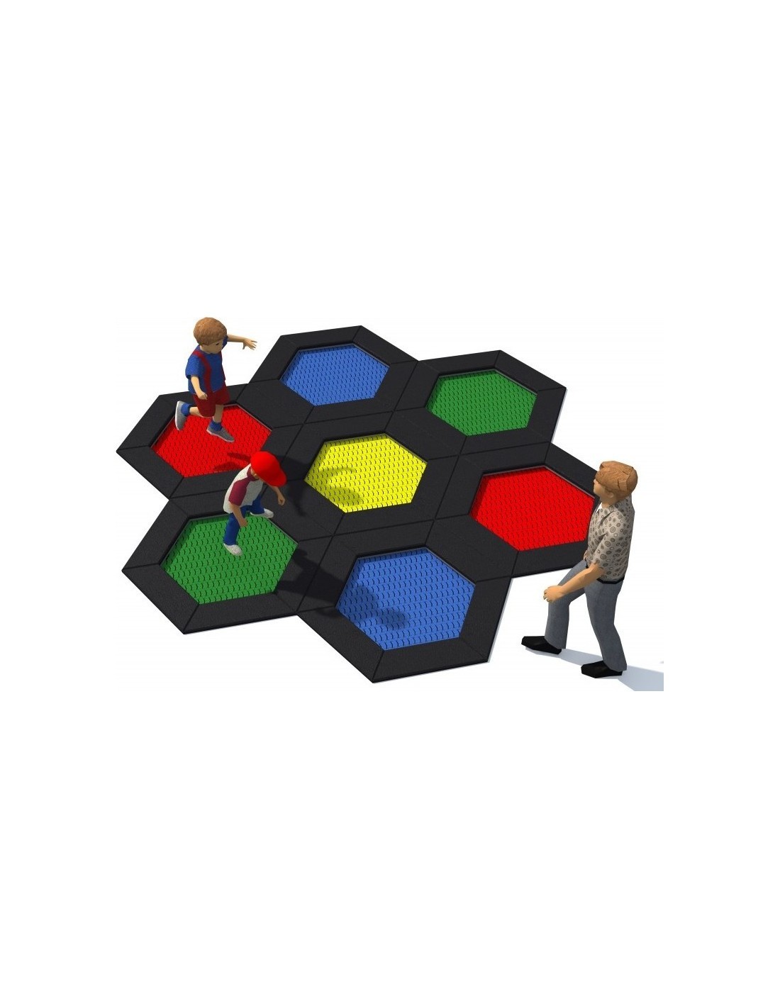 Hexagonal (honeycomb) shaped trampoline for playgrounds which are intensively use. The jumping mat is available in 6 colours and many patterns to choose. Trampoline is available in two version: openable and non-openable. Openable version facilitates cleaning inside the device.