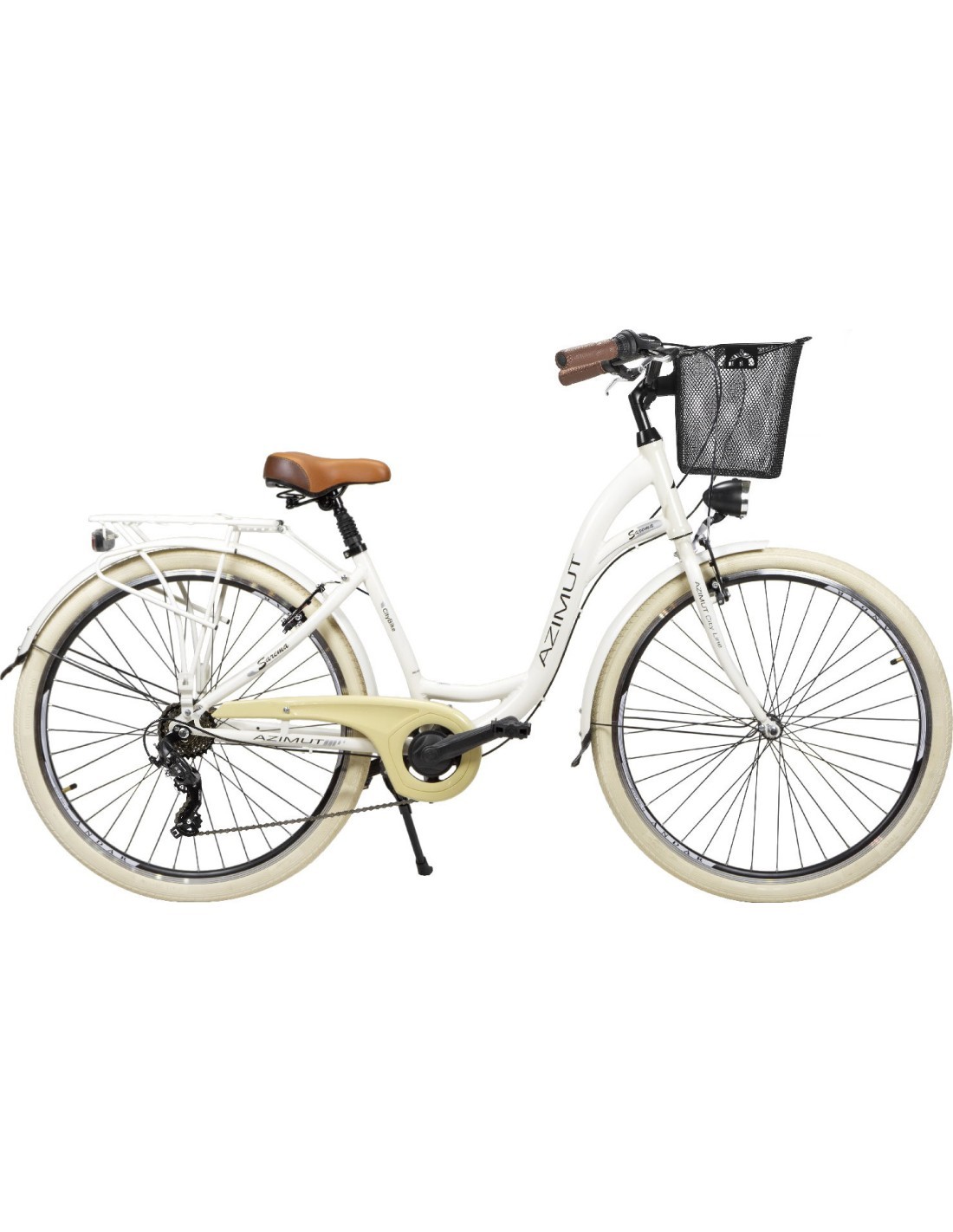 Tai tikėtina geriausias rinkoje dviračio su 7 išorinėmis Shimano pavaromis pasiūlymas. Dviratis sukomplektuotas su elegantišku ALIUMININIU rėmu, 28" ratais ir dvigubais pastiprintais aliumininiais ratlankiais bei pilna miesto komplektacija. Nuo baterijų veikiantis apšvietimo komplektas (priekyje ir gale), iki 18 kilogramų atlaikanti bagažinė. Su sukama Shimano pavarų perjungimo rankenėle lengvai pasirinksite tinkamą pavarą. Nuo purvo saugo plastikiniai skydeliai priekiui ir galui, o taip pat – grandinės apsauga. Aliumininiai rankiniai V-Brake stabdžiai priekyje ir gale (kojinio stabdžio nėra!). Komfortiškesniam važiavimui šis dviratis turi patogias bei stilingas vairo rankenėlės, tvirtą pastatymo kojelę, minkštą sėdynę bei pedalus su atšvaitais. Galima nustatyti reikalingą balnelio bei vairo aukštį. 47 mm pločio padangos su universaliu protektoriaus raštu puikiai tiks ne tik lygioms miesto gatvėms, bet ir kiek prastesniai kelio dangai. Be to, dviratis komplektuojamas su tvirtu metaliniu krepšeliu priekiui. Optimalus pasirinkimas dviratininkams, kurių ūgis yra nuo maždaug 170 cm.