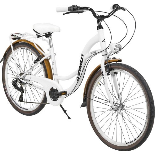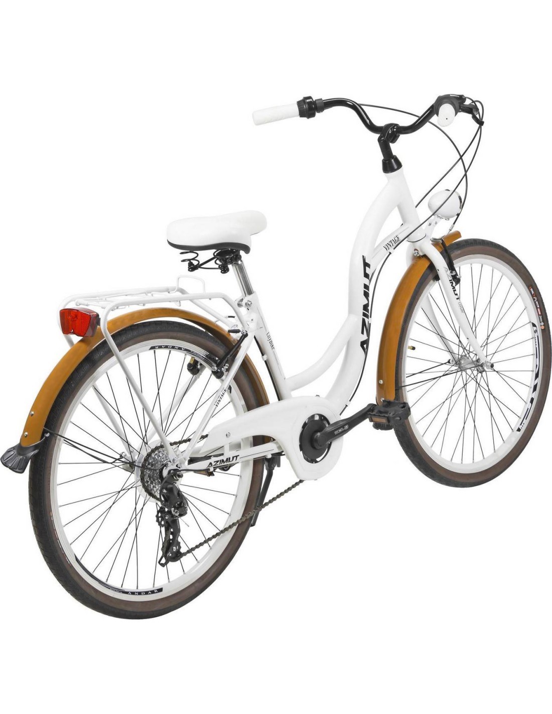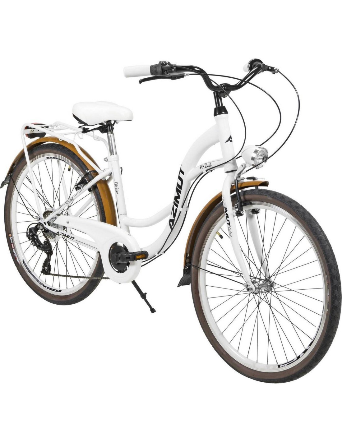 AZIMUT VINTAGE - это, пожалуй, лучшее предложение на рынке велосипедов с колесами 26", двойными ободами и передачами Shimano Tourney 7. Он предназначен для езды по городу и бездорожью, по асфальту или по твердым гравийным дорогам. Идеальный выбор для тех, кто любит традиционные городские велосипеды. 7-скоростная система позволяет выбрать передачу, соответствующую вашим потребностям. Передачи легко переключаются с помощью поворотной ручки на руле. Геометрия рамы в городском стиле и изогнутый руль позволяют ездить в расслабленном стиле, сидя почти вертикально. В стандартную комплектацию входят водные и грязевые щитки для защиты от воды и грязи. Чтобы вы не испачкали одежду во время педалирования и не зацепили ее между цепью и звездочкой, есть также защита цепи. Разумеется, позаботились и об освещении: передние и задние фары работают на батарейках. Их можно выключать и включать. Вам не придется искать столб, стену или забор, чтобы подпереть велосипед - вы можете сложить парковочную подножку. Велосипед также оснащен задним багажником. Мягкое и широкое седло с пружинами, нескользящие пластиковые педали, городские шины шириной 47 мм с универсальным рисунком протектора. Велосипед останавливается дисковыми тормозами V-BRAKE путем нажатия на тормозные рычаги на руле (ножного тормоза нет). Вы можете отрегулировать высоту/положение седла и руля в соответствии с вашими индивидуальными потребностями. Оптимально подходит для велосипедистов ростом до 170 см.