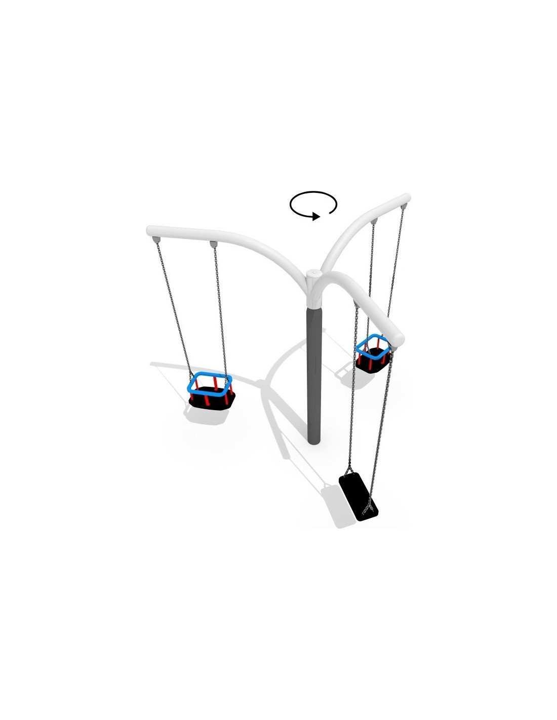 Hanging roundabout with three arms, one flat seat and two baby box seats suspended on the chains. The upper part is rotating.