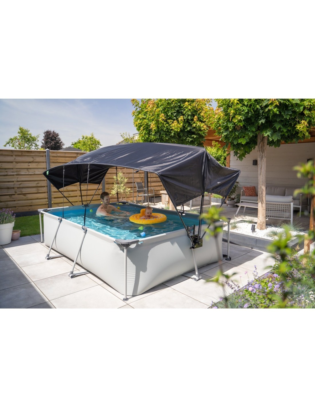Навес для бассейна EXIT обеспечивает оптимальную защиту от солнца во время купания. Навес подходит для прямоугольных каркасных бассейнов EXIT Toys размером 300 x 200 см и для многих других каркасных бассейнов размером от 290 x 190 до 300 x 200 см. Вы хотите иметь возможность наслаждаться освежающим плаванием в любое время дня, даже когда на улице солнце? Защитите себя и своих детей от ультрафиолетовых лучей с помощью этого уникального навеса для бассейнов от EXIT Toys!