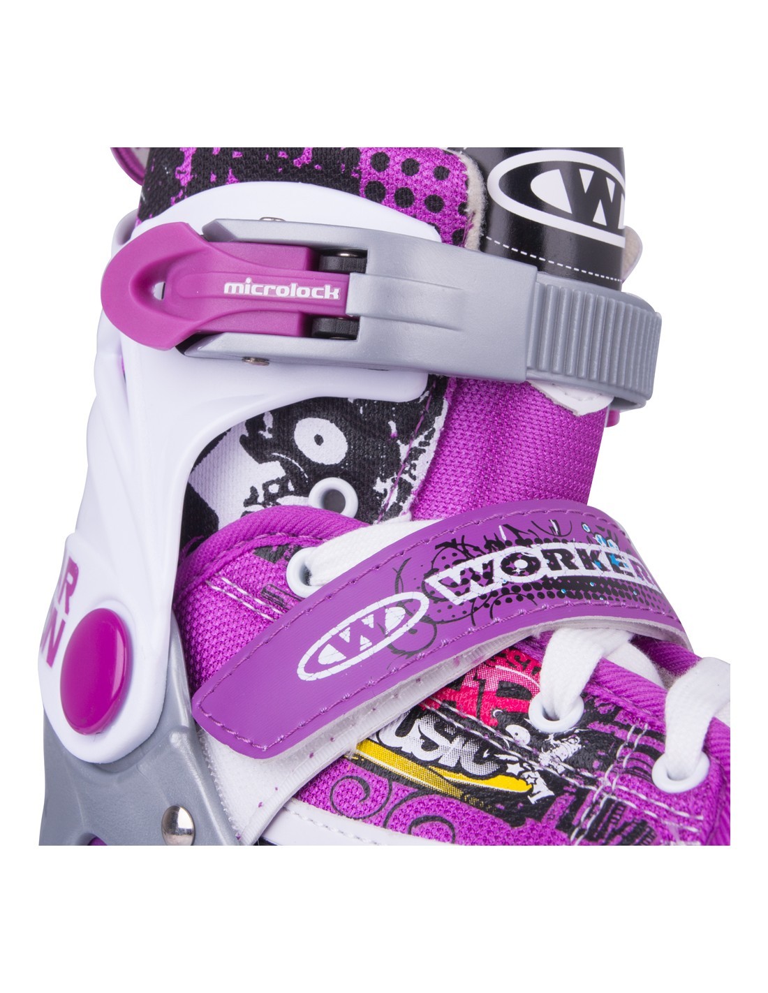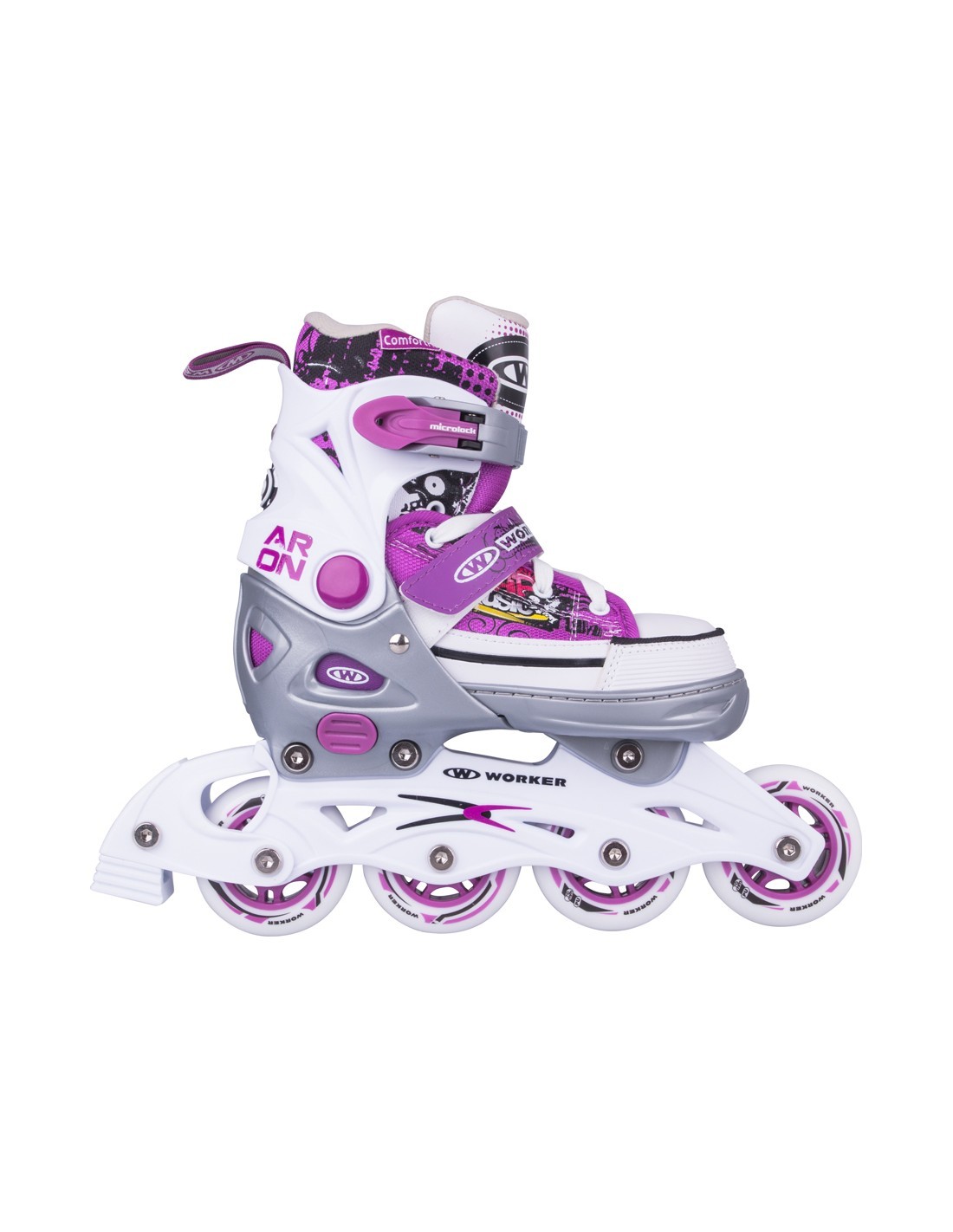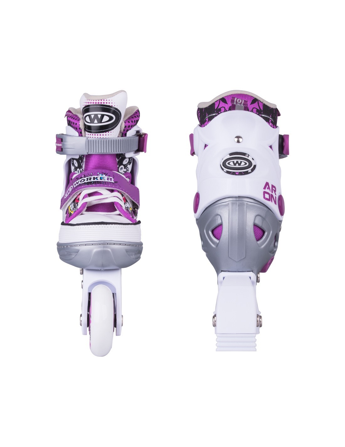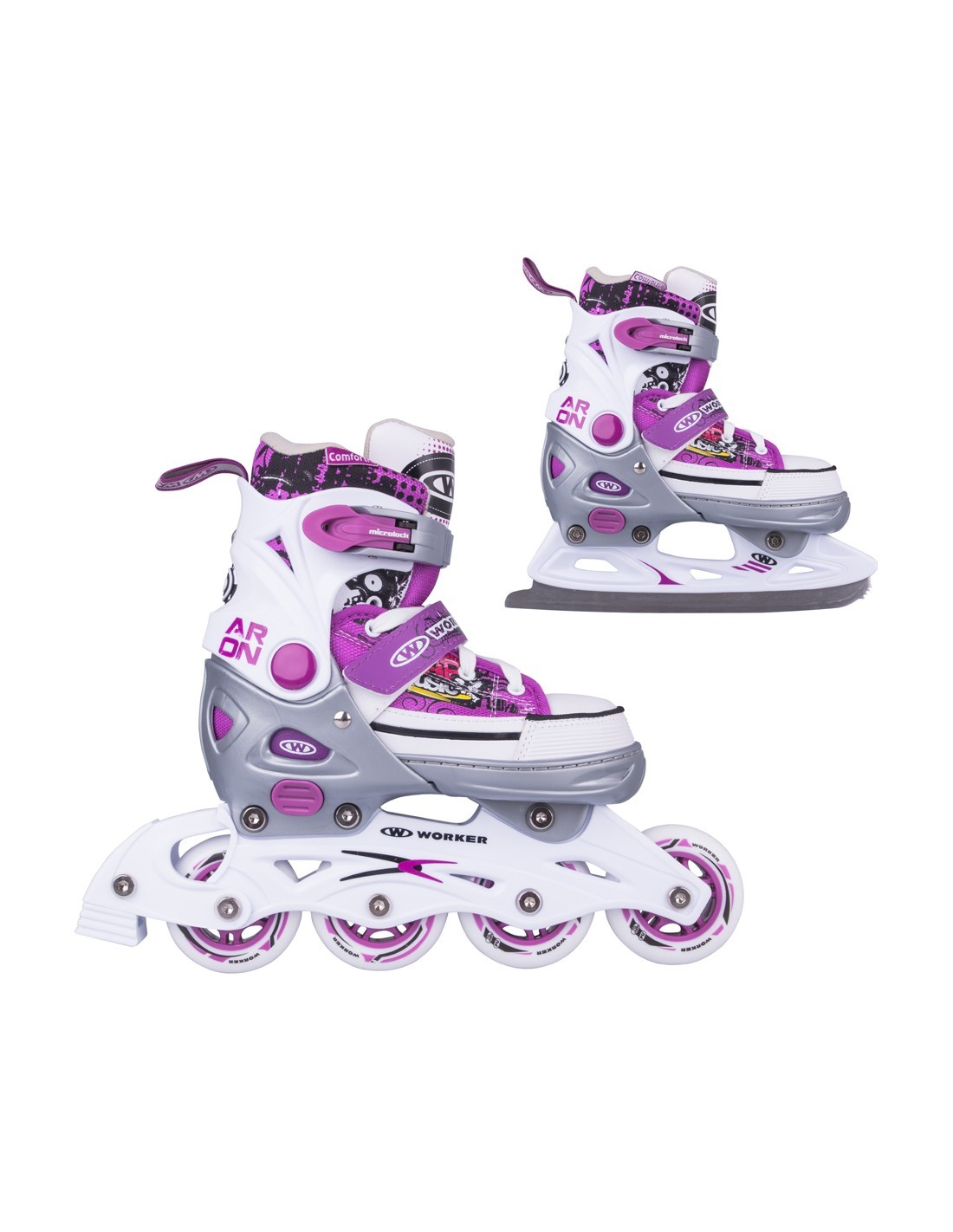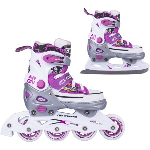 Универсальные коньки WORKER Aron белые 2в1 с лезвиями из сертифицированной стали сменные для усиленной рамы с фиберглассом для ин-лайна. Одни из самых универсальных коньков 2 в 1 на рынке благодаря запатентованной системе быстрой регулировки размера до трех размеров. Технология Safety Ankle надежно фиксирует лодыжку в правильном положении. Легкость надевания, шнуровка и двойная безопасная застежка MicroLock - другие преимущества WORKER Aron белыхконьков 2в1. Съемный тормоз на правом коньке и качественные подшипники ABEC 5 Carbon.